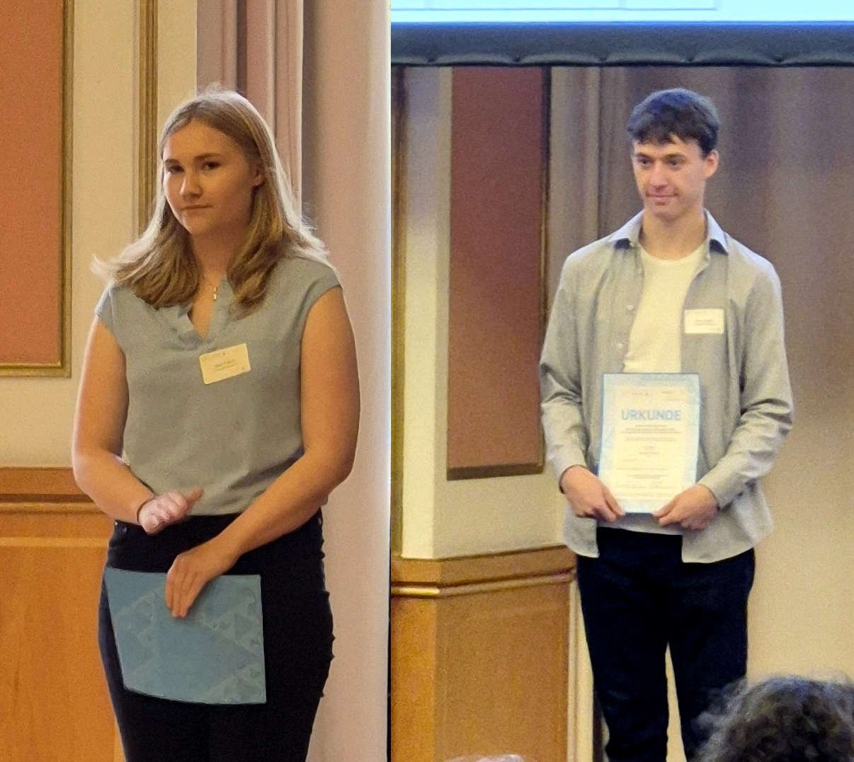 Am 23. September 2025 wurden durch den Verein mathematisch-naturwissenschaftlicher Excellence-Center an Schulen (MINT-EC) und der Senatsverwaltung für Bildung die Berliner Gewinnerinnen und Gewinner von Wettbewerben ebenso wie die Schülerinnen und Schüler ausgezeichnet, die das MINT-Zertifikat in ihrer Schulzeit erworben haben. Aus unserem Gymnasium wurden Alina Pesch und Erik Löchter ausgezeichnet. Wir gratulieren den beiden und wünschen ihnen viel Erfolg im Studium.