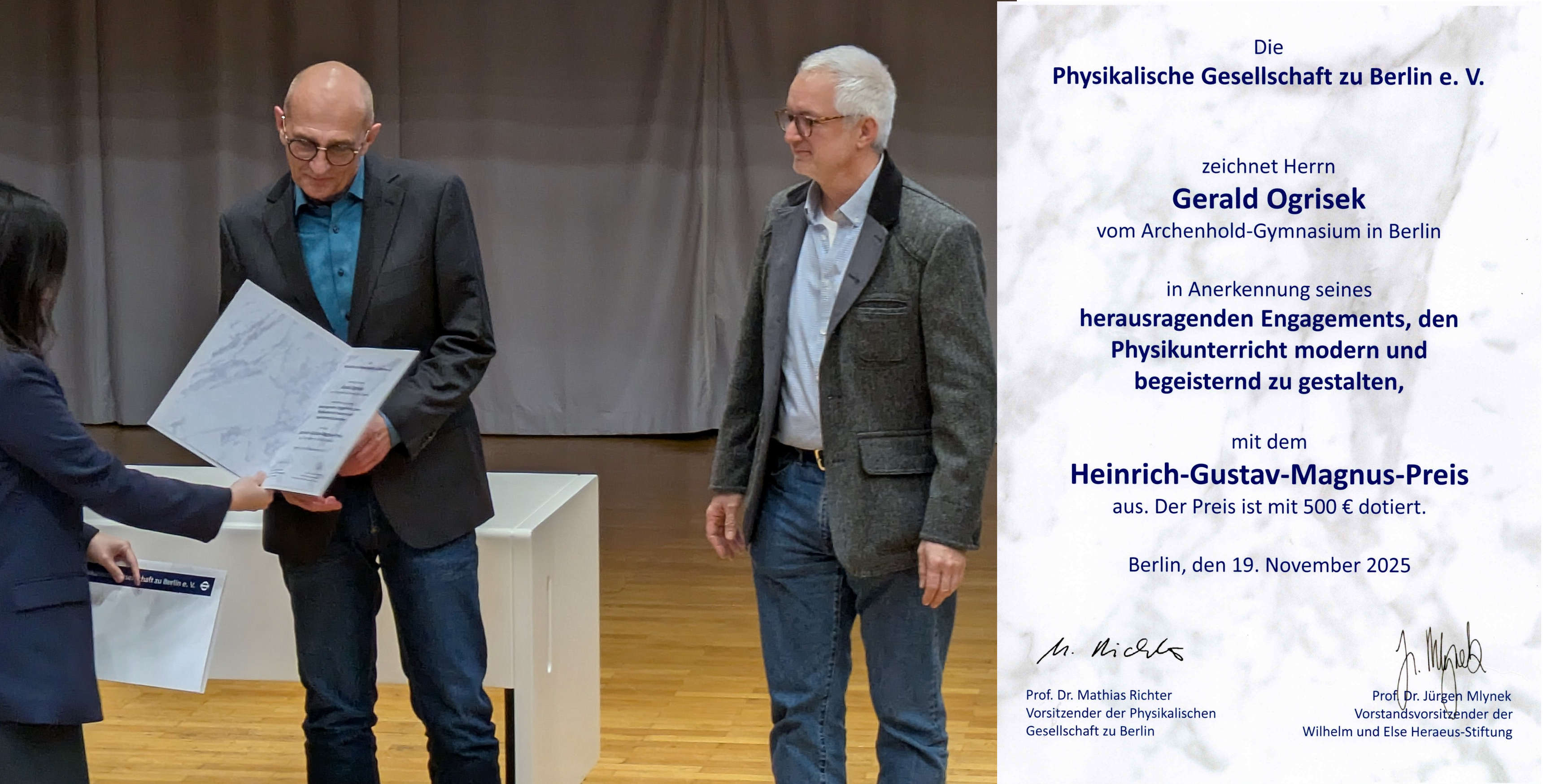 Ebenso wurden die Schülerin Lea Schmidt und der Schüler Lennard Habermann mit dem Physik-Schülerinnen- und -Schülerpreis der PGzB geehrt. Beide überzeugen durch hervorragende Leistungen und großes Interesse an physikalischen Fragestellungen. Das Archenhold-Gymnasiums gratuliert Herrn Ogrisek, Lea Schmidt und Lennard Habermann herzlich zu diesen hervorragenden Erfolgen.