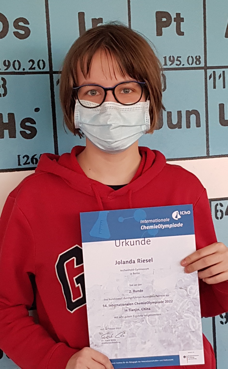 Jolanda Riesel aus dem Leistungskurs Chemie hat die zweite Runde der 54. Internationalen ChemieOlympiade 2022 absolviert und in einer 180-minütigen Klausur anspruchsvolle Aufgaben aus allen Bereichen der Chemie mit sehr gutem Ergebnis gelöst.