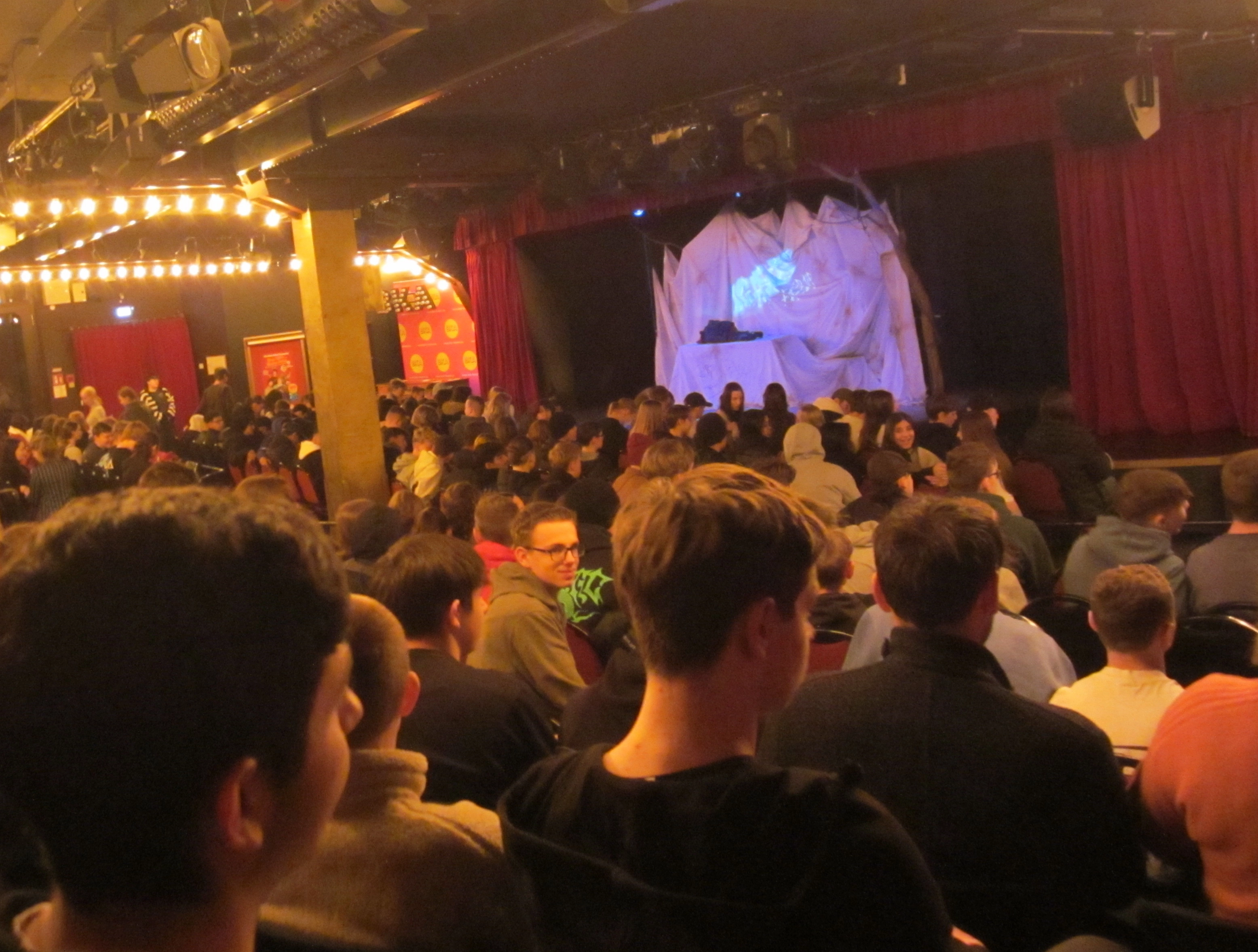 Last Friday our class 10.3 did a themed workshop on rebellion. Two actors came to our school. We dealt particularly with climate change and there was a small part where we acted out some scenes in groups. The workshop was great despite the fact that many of us had expected rebellion to be even more central in it. We enjoyed it being interactive in an interesting way, which made all students participate actively. At the end there was a lot of applause for the creative and very different ways in which all the groups played their scenes on stage.Danach gings direkt zum BKA-Theater in Kreuzberg. In dem Theaterstück, das wir dort sahen,