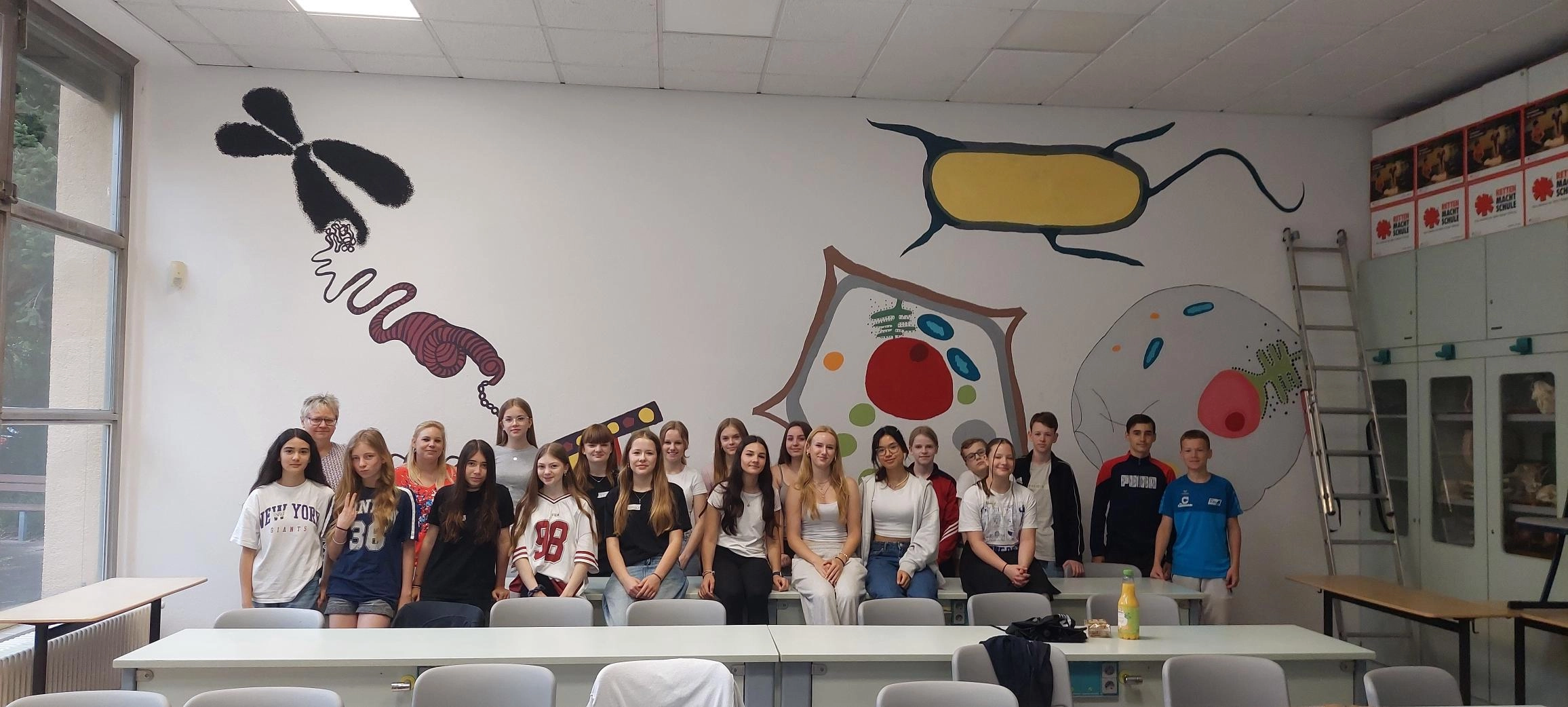 Gearbeitet wurde in zwei Teams: dem Kreativteam und dem Rechercheteam. Die Aufgabe des Kreativteams war es, ein Konzept für die Wandgestaltung zu erstellen und kreativ umzusetzen. Das Rechercheteam erstellte passend zur Wandgestaltung Lernvideos und LearningApps und zu zentralen Inhalten des Faches Biologie. So entstanden beispielsweise Abbildungen und Lernvideos zu den Themen die DNA, die Zelle, das Blut und das Nervensystem. Poster zum Thema „Verborgene Welten“ mit mikroskopischen Darstellungen verschiedener Lebewesen wurden von dem Projektteam systematisiert, an den Schränken des Fachraumes angebracht und mit fachlichen Beschreibungen ergänzt.